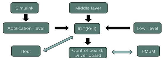 Figure 4 is the control flow diagram generated by the code. The application layer, based on MBD, can directly generate C-language code. The host is used for controlling motor startup, debugging, and data collection. In Figure 4, the low-level code is manually configured, including components such as an ADC (analog-to-digital converter), timers, and serial ports. ADC, timers, and serial ports are key interfaces in the REP. The middle layer serves as a bridge connecting the application layer and the low level. Only a minimal amount of code is required to connect the input and output interfaces. This manual configuration of low-level code defines our approach as semi-automatic code generation or model-based design (Semi-MBD). Eventually, all code is compiled in an integrated development environment (IDE), Keil v5, before being uploaded to the control board.