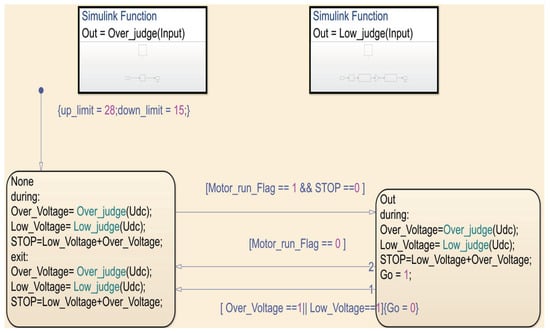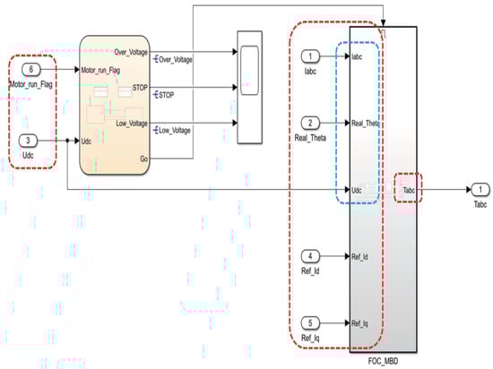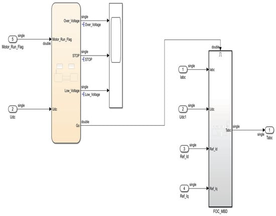 Figure 5 presents a diagram of the Simulink model for sensor-based control. This Simulink model is capable of not only performing simulations but also generating code for the application layer. Simulink, a MATLAB-based software, offers a graphical programming environment for modeling, simulating, and analyzing multi-domain dynamic systems. Its ability to generate code is particularly useful in streamlining the process of translating a simulated model into real-world applications, especially in complex control systems used in motor control. The Simulink model within the ‘FOC_Algorithm’ is shown in Figure 6. The ‘FOC_Algorithm’ consists of two parts: ‘Chart’ and ‘FOC_MBD’. The chart is used for controlling startup and bus voltage protection. ‘FOC_MBD’ is utilized for generating the application layer code. As shown in Figure 6, a total of five inputs is introduced into ‘FOC_MBD’, namely IABC, Real_Theta, Udc, Ref_Id, and Ref_Iq. Among these, IABC and Udc are obtained through ADC acquisition, Real_Theta is acquired via an encoder, while Ref_Id is typically set to zero, and Ref_Iq is a reference input obtained from a supervisory computer. Additionally, the output of ‘FOC_MBD’ is Tabc, for which the waveform is a saddle wave that is used in conjunction with timers to generate PWM (pulse width modulator) signals. The internal components of ‘Chart’ and ‘FOC_MBD’ are shown in Figure 7 and Figure 8, respectively.