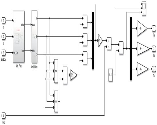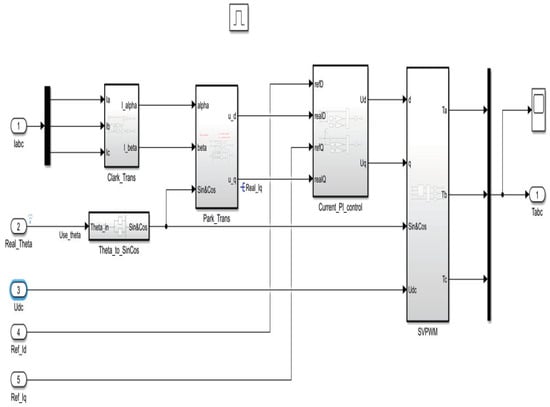 In Figure 8, ‘Current_PI_control’, ‘Clarke_trans’, and ‘Park_trans’ correspond to Equations (2)–(4), respectively. The more complex SVPWM corresponds to Equations (5)–(7), as shown in Figure 9.