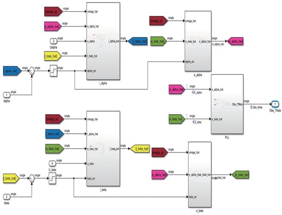 Figure 10 and Figure 11 present the Simulink diagram for the sensorless control system. Compared to that of the sensor-based system shown in Figure 5 and Figure 6, the angle in this sensorless setup is not acquired from an encoder but is instead estimated using a combination of HSMO and PLL. Figure 12 shows the model for obtaining the angle in the sensorless system, where the electrical angle is estimated through HSMO combined with PLL. The construction of this model is based on Equation (14) and Figure 3.