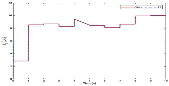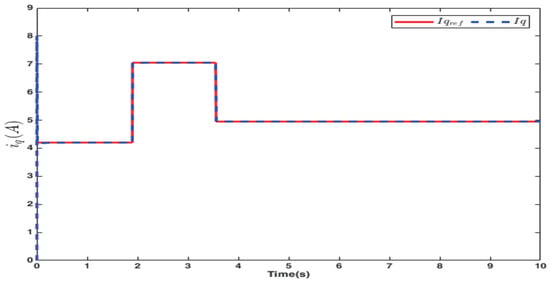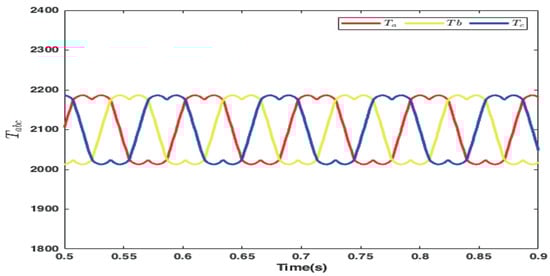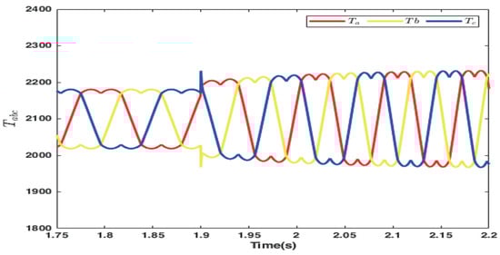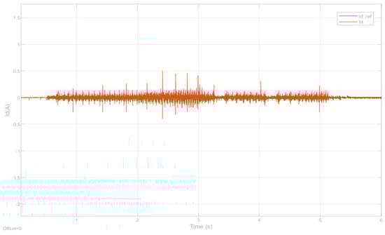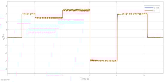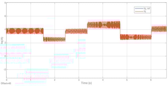 Figure 13, Figure 14 and Figure 15, respectively, show the d-axis current tracking waveform with the sensor, the q-axis current tracking waveform, and the saddle wave waveform. Figure 13 and Figure 14 demonstrate effective tracking performance, thus validating the feasibility of the simulation results. From Figure 13, it is evident that with the strategy where , the value remains consistently at zero. Additionally, as shown in Figure 14, the current is effectively tracked against the desired current. Figure 15 simultaneously presents a distinct saddle wave, where the variations depicted are due to changes in the current.