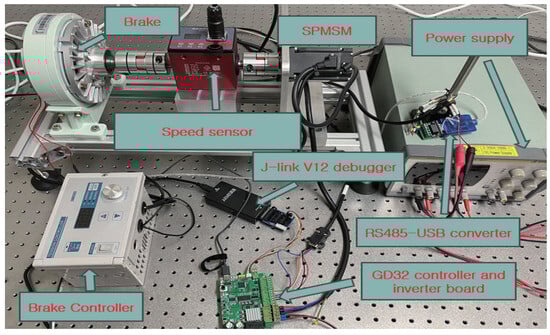A PMSM driven by a PWM inverter connected to a three-phase voltage source was developed. This inverter operates at a switching frequency of 10 kHz. To introduce load disturbances, a current brake is employed to modulate the output torque of the eddy current brake by varying the excitation current. The control algorithms discussed in this study were implemented in a GD32F407RET6 microcontroller (GigaDevice, Beijing, China), which operates at a clock frequency of 168 MHz. These programs were developed using Keil IDE version 5.36 and were subsequently transferred to the microcontroller via a J-link debugger (version 12). The experimental data were collected using a speed sensor. The configuration of the experimental hardware is illustrated in Figure 19.