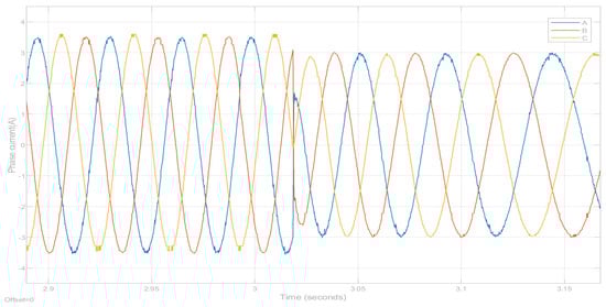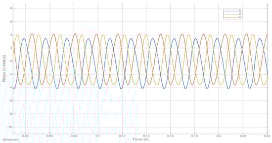 The results with sensorless control are presented in Figure 23, Figure 24 and Figure 25, which illustrate, respectively, the outcomes for the d-axis current, the q-axis current, and the three-phase current. The figures show favorable control results, affirming the feasibility of the REP. The outcomes of sensorless control exhibit slightly more fluctuation compared to those of sensor-based control, but are viable for sensorless control applications. In sensorless control, the current ripple is larger compared to sensor-based control, which is deemed reasonable and feasible. This is because, in sensorless control, it is necessary to estimate the electrical angle which directly affects the current. However, as observed in the three-phase current from Figure 25, although there are fluctuations in the current ripple, they remain within the range of ±1 A. To validate the effectiveness of the REP approach, the parameters here are kept consistent with those used in the sensorless simulations.