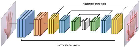 In order to minimize the effect of redundant information such as the background, before extracting hand joint point coordinates, we use a detector to obtain the hand region and remove the non-hand region in the image. Acquiring hand regions from images is a difficult task because our model needs to detect hands of different shapes and sizes. To address the above challenges, we use a palm detector with a pyramid structure, as shown in Figure 2. Compared to hands with variable shapes, the shape of palms is more fixed, typically a rectangle, and therefore is easier to be detected. The hand area can be obtained by expanding the palm area. In addition, the network model with an hourglass structure can extract different sizes of bounding boxes, so different scales of hand regions can be detected.