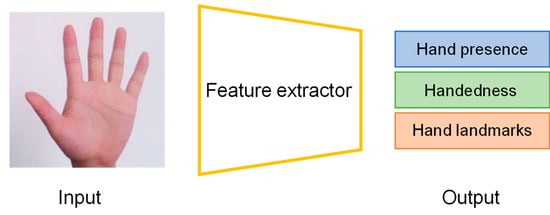 Pipeline of hand landmark model. The input is a picture, and the model has three outputs sharing a feature extractor: hand presence, handedness, and hand landmarks.