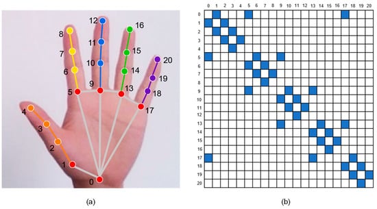 (a) Hand landmarks extracted by the model are spatially interconnected to form a skeletal map of hand. (b) Adjacency matrix of 21 hand landmarks.