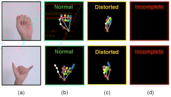After obtaining the hand landmarks, if the number of detected articulation points is not equal to 21, then we take the original image as input and use the lightweight convolutional neural network model to obtain the category label. As shown in Figure 6, there are three types of landmark detection result: normal, distorted, and incomplete. When the landmarks are incomplete, we cannot classify gestures through the GMLP head, so a lightweight convolutional neural network model, such as ShuffleNet or MobileNet, is employed to recognize the gesture from the image.