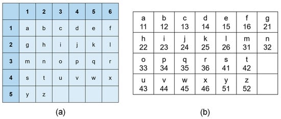 (a) Two-dimensional alphabet layout. (b) The 2-digit alphabet code table. The 2-digit code of a letter is denoted by the combination of row and column numbers.