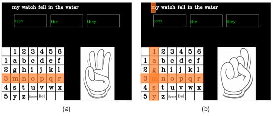 Demonstration of iHand to type letter “m”. (a) Step 1: gesture 3 to select row 3. (b) Step 2: gesture 1 to select column 1. The “m” in row 3, column 1 is entered as highlighted.