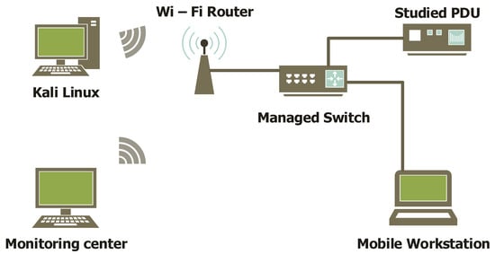 Figure 1 presents the experimental setup for studying the network security level and penetration testing of the tested PED. The experimental setup consists of a workstation with Kali Linux installed on it. “Kali Linux” and the “Monitoring center” are connected to the “Studied PDU” using Wi-Fi technology. The experimental network is closed and it is not connected to the Internet. The managed switch is connected to the wireless router. The studied PED and the mobile workstation are connected to this switch. A managed switch is chosen to be used due to the support of the mirror port feature. Due to this functionality, all the traffic that is handled by the switch is copied to this port. The mobile workstation is connected to this port and, with the installed monitoring tools, it monitors the traffic exchanged between the PED and the monitoring center.