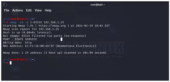 Figure 2 presents the results of the port scanning. The command “-sS” means that the Nmap port scanner uses the TCP protocol and the 3-way handshake procedure. The IP address of the studied PDU is 192.168.1.25. As can be seen from the results, the only open port is port 80 (http), which is used for remote access to the studied PDU.
