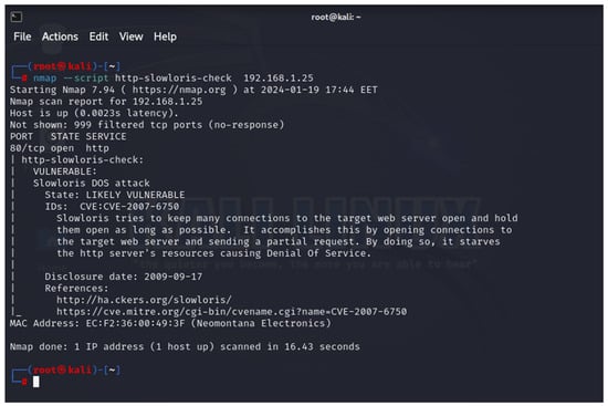 Nmap has the ability to use special scripts that can be used for finding out if specific vulnerabilities are present on the studied device []. Figure 4 shows the result of using the “http-slowloris-check” script. This script is used to find out whether the studied PDU is vulnerable to DoS attacks, without such attacks being performed. The result “LIKELY VULNERABLE” means that the studied PDU was subject to an attack but, depending on the architecture of the used inner http server and the resource constraints, a complete denial of service is not always possible. Carrying out complete testing requires the application of actual DoS attacks and studying the server response of the studied PDU. Such studies are presented in Section 5.2.