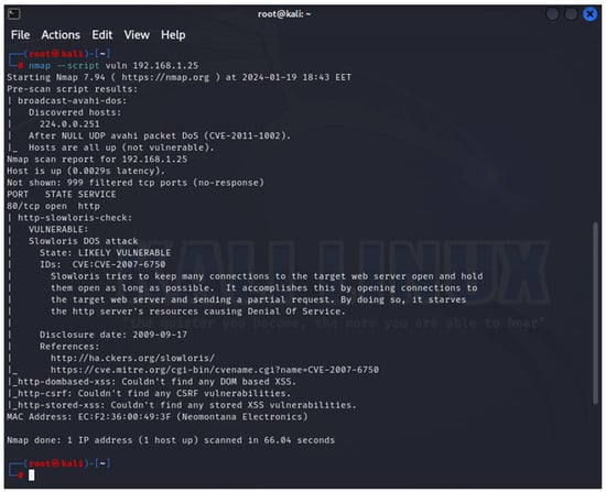 - Nmap (version 7.94): This is a tool that is used for discovering the security vulnerabilities of various communication devices. In addition, this tool has a different set of scripts through which it finds out the most common cybersecurity vulnerabilities of the devices [];