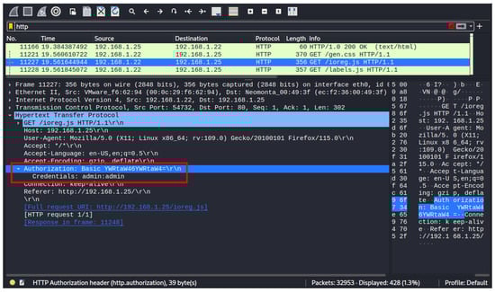 Figure 6 shows a sample of one of the captured packets that was exchanged between the studied PDU (192.168.1.25) and Kali Linux (192.168.1.22), acting as the management and monitoring station. The figure shows an unpacked packet, which was used for exchanging user credentials, that allows remote access to the PDU. As can be seen, the password and username were encoded and transmitted using only Base64, which is very easy to decode, as shown by the result. Wireshark immediately decodes the encoded username and password and shows what they actually are.
