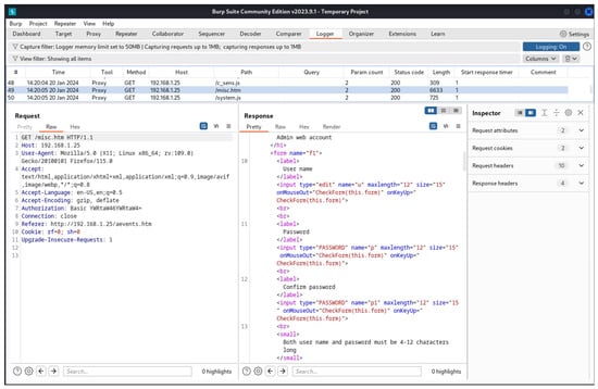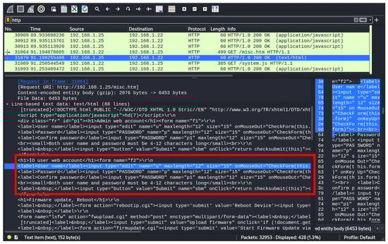 Figure 9 shows how the information was exchanged when the page where the administrator’s username and password can be changed was opened. Again, the information was transmitted in plain text. Additional methods, techniques, and technologies need to be applied to secure the studied device from unauthorized access. Such methods, techniques, and technologies are discussed in [,,,,].