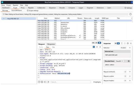 The Burp Suite Community Edition was used to validate the results obtained from Wireshark. Figure 8 presents a result that confirms the results obtained with Wireshark about the way the username and password were exchanged.