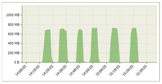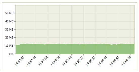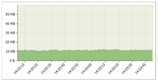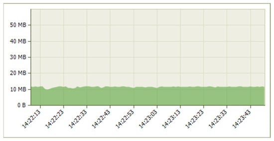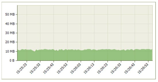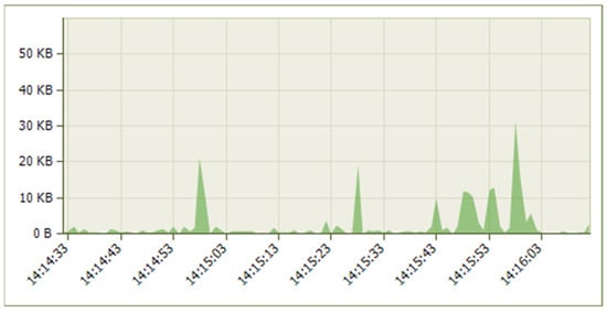 Figure 10 represents the communication traffic proceeded by the studied PDU. This graph represents the processed traffic during normal operation mode. The device was not under attack. The results were obtained from Capsa Colasft Free. As can be seen, the traffic was minimal, which is normal for the PEDs. This graph will be used as a reference graph for comparison with the following results, which were at times when the device was subjected to various TCP DoS attacks.