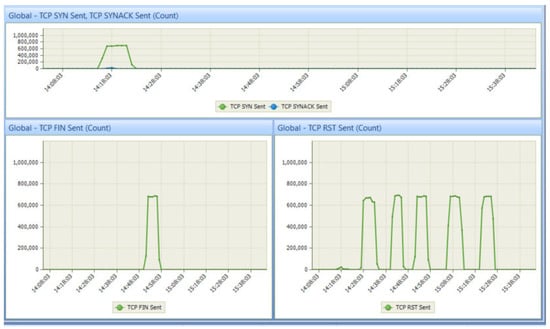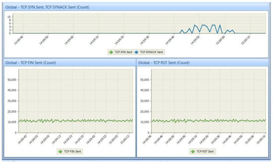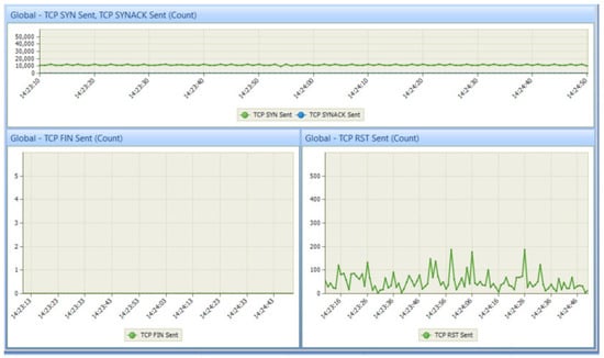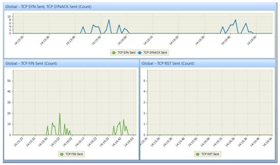 Figure 11 shows the distribution of the different TCP packets. Again, the results were obtained from Capsa Colasft Free. Again, these graphs represent the normal mode of operation. The graphs will be used as a reference for comparison with the following results. As can be seen from the graphs, the values of the different TCP packets for the studied device were normal. Since the PDU was only accessed by a browser, a continuous exchange of TCP packets was therefore required to maintain the HTTP session. As can be seen from the graph, there were TCP SYN and TCP SYNACK packets as well as TCP FIN packets. This is evidence of a successful three-way handshake, a completed TCP session with data exchange and termination of the TCP session after the data exchange was completed.
