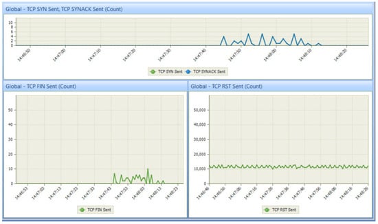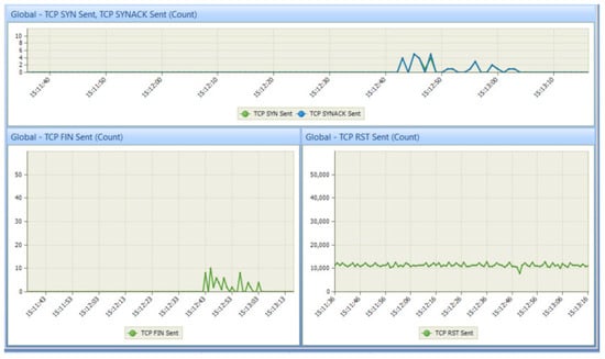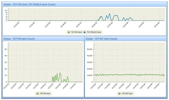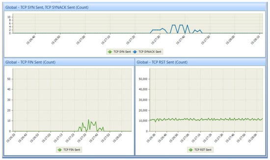Figure 15 represents the values of the individual TCP packets during the attack. There was a huge increase in the TCP RST packets that were generated by the PDU. This increase was due to the TCP ACK attack, where a huge number of TCP ACK packets were sent but there were no TCP SYN packets. Therefore, the internal web server was generating TCP RST packets to terminate the session. The interesting thing to mention here is that, during the TCP ACK attack, the PDU was accessed remotely. This is evidenced by the presence of the TCP SYN sent packets and the presence of the TCP SYNACK sent packets, through which the TCP session establishment was confirmed. The presence of the TCP FIN packets, which terminate the TCP session after the data exchange has completed, proves the successful remote access of the PDU.