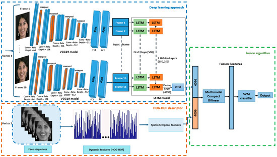 This research introduces a novel algorithm that merges two methodologies for facial expression recognition. The initial method employs deep learning models to extract visual features from video sequences. Specifically, the ResNet model is utilized for face extraction, and the VGG19 model is employed to generate a vector serving as an input for the LSTM (Many-To-One) model. This LSTM model constructs one descriptor vector of size 4096. This vector is combined with a second descriptor vector extracted using the HOG-HOF descriptor, which integrates appearance descriptor and motion descriptor HOF for spatial–temporal video processing. The resulting combined vector is subjected to SVM classification, utilizing two concatenation methods: MCB and simple concatenation. The results obtained with a score of 98.24% using the eNTERFACE05 database indicate that our fusion of the two methods yields better scores compared to state-of-the-art methods. We expect that the results of this study will set the groundwork for advancements in emotion recognition and related research. Integrating multiple modalities such as facial expressions, speech, gestures, and physiological signals can lead to more comprehensive and accurate emotion recognition systems. Future research could focus on developing sophisticated fusion techniques to combine information from different modalities effectively and using several datasets to improve our approach.