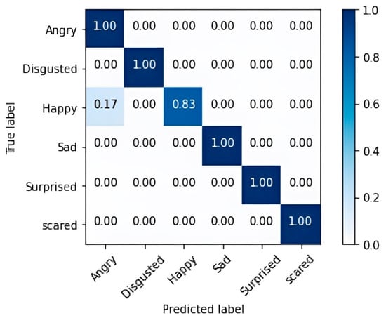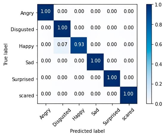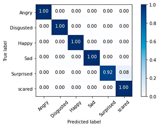 After analyzing the results of all emotion recognition accuracies, especially for “Disgusted”, “Sad”, and “Scared”, we obtained recognition accuracies above 0.98, while “Happy”, “Surprised“, and “Angry” had relatively lower accuracies, although still above 0.88. This suggests that emotions such as “Surprised“ and “Angry“ may have subtle facial expressions that are easily confused with other emotions, making them more challenging to classify accurately.