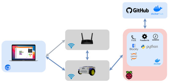 The software of FOSSBot is installed in the microprocessor and it is available on GitHub, thus allowing the open-source community to download and make a contribution to it. The software updates are deployed and integrated continuously with the help of dockerized images (https://github.com/eellak/fossbot, accessed on 2 April 2024).