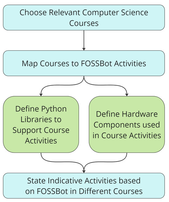 The design of a study curriculum is a complex process that requires several steps such as the definition of its objectives, the assessment of student needs, the review of existing curricula, the actual development and testing of the curriculum, and the final implementation. This complex process is still beyond the scope of the current study, which however takes the courses that are usually found in computer science curricula in the last years of undergraduate programs or at the postgraduate level and proposes how they can be taught using a single educational robot. Microprocessors, sensors, and actuators play an important role in the development of solutions for real-world problems. Educational robots offer a valuable tool for enhancing computer science-related activities. In pursuit of this objective, we have chosen to employ FOSSBot and integrate its functionalities into selected courses. Since the software of the FOSSBot is built upon the Python programming language, we have established Python libraries to facilitate course activities. Furthermore, the hardware components of the robot are integral in shaping the nature of these activities. Subsequently, we delineate specific activities associated with the hardware components of the robot. The key steps of our methodology are summarized in Figure 4 and in what follows we explain how eleven core computer science courses can be supported in their activities during the classes using the robot.