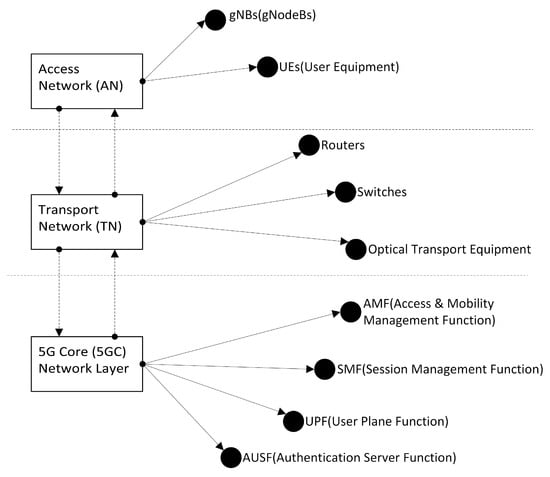 3- 5G Core (5GC) Network Layer: This central control plane manages user sessions, routing traffic, and provides network security. The Access and Mobility Management Function (AMF), Session Management Function (SMF), User Plane Function (UPF), and Authentication Server Function (AUSF) are some of the key functions in the 5GC layer. The AN layer is connected to the TN layer and the TN layer to the 5GC layer. This allows for the seamless flow of data between the different layers of the 5G network [].