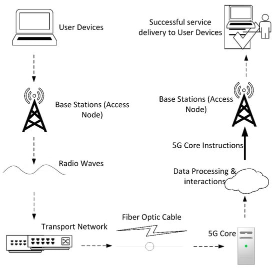 Initially, user devices transmit data to the nearest base station in the AN, which subsequently relays this information to the TN through radio waves. The TN, equipped with high-speed fiber optic cables and other advanced technologies, efficiently transports the data to the 5G core. Upon arrival at the 5GC, the data undergoes processing, and interactions with other networks are facilitated if necessary. Subsequently, the 5GC communicates instructions back to the AN via the TN. These instructions serve as directives for the AN to control the radio signals effectively, enabling the delivery of seamless services to user devices [] as depicted in Figure 2.