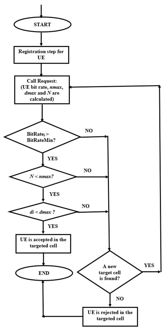 - The call admission control algorithm (CACA) proposed in [] is applied in this study. The analysis is based on the soft handover principle in 5G networks, which allows the user equipment (UE) to connect gently with many Node Bs at the same time, as illustrated in Figure 4. Given that the signals will be conveyed, no resources will be granted until the UE meets the admission requirements defined by Node B, which are characterized in our model as the minimum bit rate threshold and minimum distance. This research effort assumes multi-cell deployment, as indicated in Figure 3, where the user equipment (UE) is softly connected with more than one Node B at the same time, However, during the soft handover process, UE will only be linked to one Node B based on the strongest signal, which is computed in the model using a threshold of minimum bit rate, minimum distance, and interference levels between the cell and other surrounding cells. The two parameters needed for the CACA are the maximum distance, dmax and the maximum number of active users, nmax. Note that all symbols and associated descriptions used in the following equations are listed in Table 1.