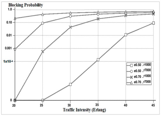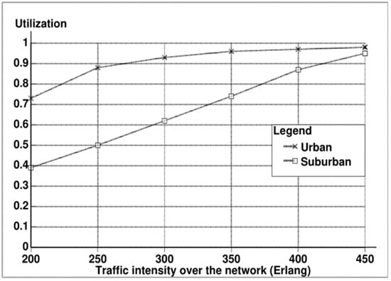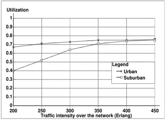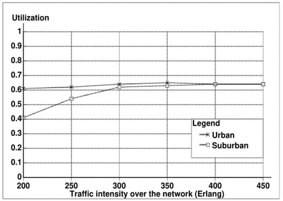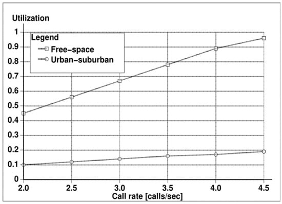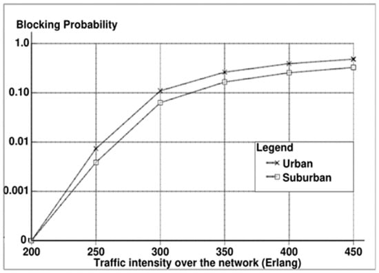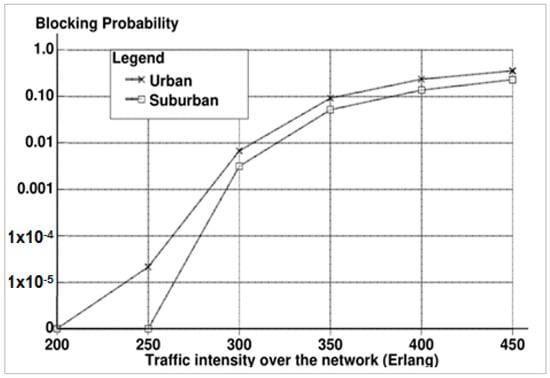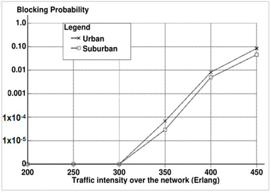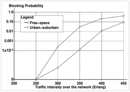 The next two sets of results (Figure 15 and Figure 16). Comparative results are discussed to compare the performance of an ideal environment (i.e., free space) where no propagation is considered with a more realistic environment (i.e., urban-suburban). It can be noticed from Figure 15 that starting from Erlang 250, the performance of the network is significantly affected concerning the blocking probability in Figure 15 and the bandwidth utilization in Figure 16. This is expected as in a more realistic environment, the signal is attenuated due to the obstacles caused by the propagation mechanisms such as scattering, reflection, and diffraction.