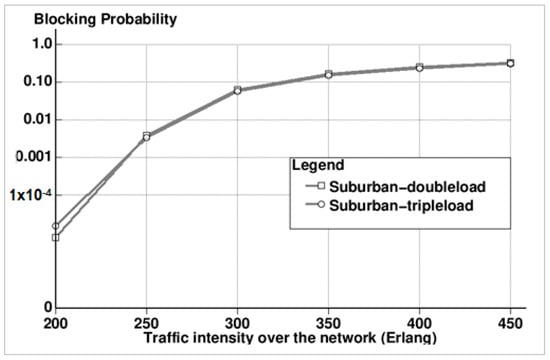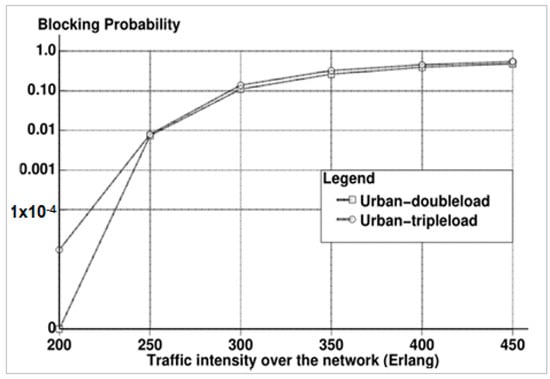 The influence of load concentration on the inner cell is shown in Figure 11 and Figure 12. Two cases are considered, firstly when the load is doubled and secondly when the load is tripled against the outer cells. In both cases, the overall network load is the same. What is interesting about this is that, usually the CACA works in both cases to balance the load, therefore, no major effect of this increase can be noticed either in the urban cell or in the suburban cell.