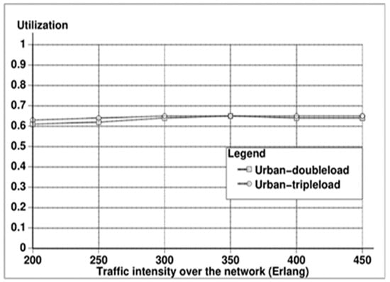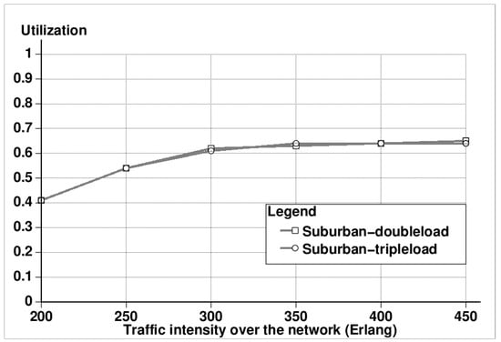 The influence of load concentration on the outer cells is shown in Figure 13 and Figure 14. Two cases are considered, firstly when the load is doubled and secondly when the load is tripled. Now, we can notice that a slight change appeared below traffic intensity of 250 Erlang compared to urban areas, afterwards, the lines for blocking probability and utilization are almost matching. This can be explained that suburban areas usually have less density of users compared to the urban areas and therefore, doubling or tripling the load does not make a big change since suburban areas are able to service most users and the users who are closer to cell border will make handover to be served by the neighboring cells. All of these actions will be controlled by the CACA who is responsible for balancing the load over the whole network regardless of the load concentration or the cell location.