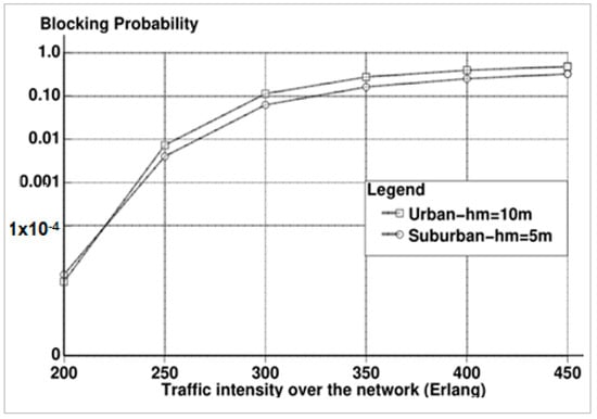 Blocking Probability for urban suburban environments (hm = 10 m, 5 m).