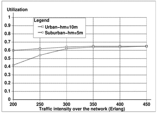 The effect of the height of the mobile (hm) and the height of the base station (hb) is discussed in the last set of Figure 17, Figure 18, Figure 19 and Figure 20. Figure 17 and Figure 18 show the effect of the height of the mobile on the performance regarding both the blocking probability in Figure 17 and the bandwidth utilization in Figure 18. Two values of hm are considered (5 m in a suburban cell and 10 m in an urban cell). Now, a higher value of hm in urban areas is expected since the urban area has high buildings, and the system starts behaving like in the free-space propagation model as there will be many connections in the line-of-sight with Node B. In this case, the network performance reaches a stable state. At a lower rate, the suburban area has better performance, starting to be matched for both environments at higher rates. The network performance regarding hb (Node B) is given in Figure 19 and Figure 20 for the urban environment concerning three values of height, namely 50 m, 100 m, and 150 m. It can be noticed that increasing Node B height can reduce the blocking probability and increase the bandwidth utilization, however, no dramatic increase is noticed. Therefore, we can conclude that this issue is considered an optimization factor regarding cost performance and should be considered in the planning of 5G design and infrastructure.