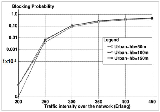 Blocking Probability for urban environments (hb = 50 m, 100 m, 150 m).