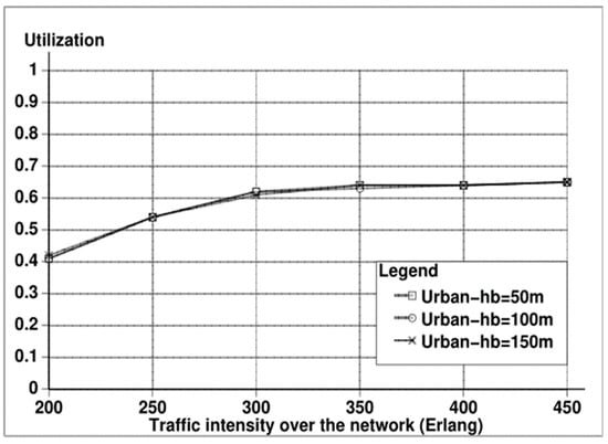 Bandwidth Utilization for urban environments (hb = 50 m, 100 m, 150 m).