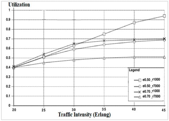 To study the effect of the cell radius on the network performance, we introduce here Figure 21, Figure 22 and Figure 23. The blocking probability is introduced in Figure 21. Two different cell radius values are considered (r = 1 & 7 km) with two interference values (ε = 0.50 & 0.70). It can be noticed that with the low value of the interference, the lower the cell radius, the better. When the cell radius is low this means the coverage of the cell is reduced and therefore a smaller number of users are admitted and requested a service at the cell. This is why ideal values of the blocking probability are obtained. Only 0.10 blocking value is obtained at the maximum traffic intensity of 45 Erlang. On the other hand, a round 90% blocking is obtained at the same traffic intensity when the radius of the cell is increased to 7 km under high interference value (ε = 0.70). As per our suggested model and considering real life status, urban areas have less cell radius compared to suburban areas and therefore, the impact of signal penetration due to the propagation phenomena is higher compared to suburban areas. Similar results are obtained for the utilization values in Figure 22. At maximum traffic intensity, the utilization exceeds 90%. Because the propagation effect in urban areas is more than suburban areas, the capacity of the cell degrades when the cell radius is small as shown in Figure 23. At a cell radius of around 8 km, less than 50 users are covered and receive service. On the other hand, at a cell radius of around 15 km, more than 150 users are covered.