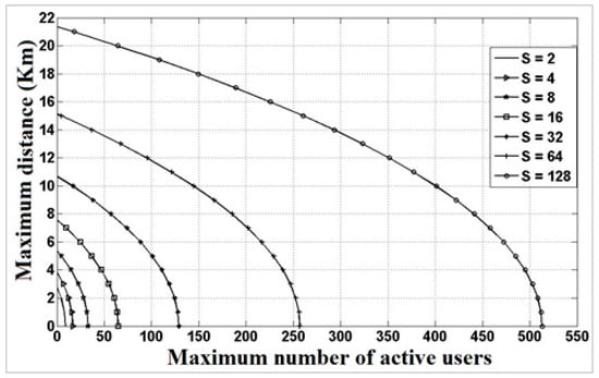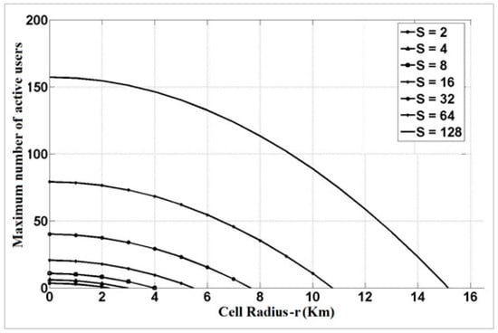 Capacity against cell radius under different service factor parameters (S = SF/SNR).