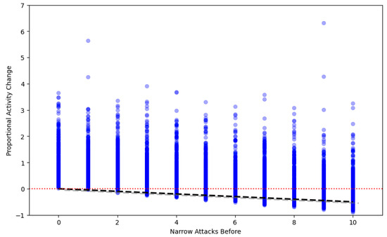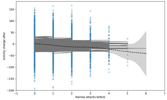 Activity before and the number of received narrow attacks vs. ANCOVA test of activity difference.