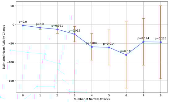 To quantify the uncertainties in our observations, we employed one-sample t-tests to estimate the mean activity changes across different attack frequencies, acknowledging limitations in data availability for higher numbers of attacks. This approach allowed us to construct confidence intervals and assess statistical significance, which we visualized through bar plots annotated with p-values. Despite broader confidence intervals for rarer, higher-frequency attacks, our analysis suggested a statistically significant decrease in activity starting from certain attack thresholds. Additionally, we performed an ANOVA test to investigate the overall trend across attack frequencies, further supported by post hoc analyses, revealing statistically significant differences. Figure 4 presents a summary of the t-test results for narrow attacks: the columns include the number of attacks, estimated mean change, confidence interval (low, high), and p-value. The significance thresholds crossed at three and four attacks, with broader confidence intervals for rarer higher-frequency attacks due to sample size limitations.