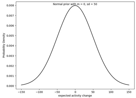 Adopting a Bayesian framework, we estimated the posterior distributions of the mean activity changes for different attack frequencies, utilizing skeptical prior distributions (see Figure 6. The figure shows the wide skeptical prior for a Bayesian analysis, which is a normal distribution with a mean of 0 and a standard deviation of 50. The plot includes the probability density function for the normal distribution over a range of expected activity changes. This method provided a nuanced view of how prior beliefs could be updated in light of new evidence, resulting in a consensus across different priors about the general trend of decreases in activity with more frequent attacks.
