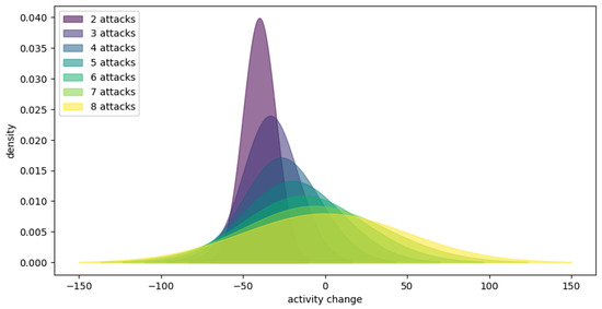 Figure 7 presents the posterior distributions for activity changes across attack frequencies. It depicts the density plot of the means of the posterior distributions for 0–9 narrow attacks using a wide prior, illustrating how data update prior beliefs about the impact of attacks on activity. The posterior means shift toward more negative values as the number of attacks increases, indicating a consensus on the negative impact of attacks, irrespective of the prior used.