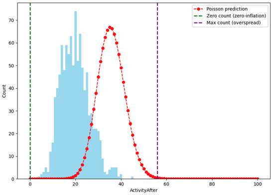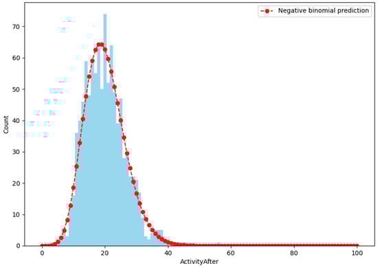 Figure 9 shows the predicted vs. actual activity post-attack. It describes the predictive accuracy of the chosen model, comparing the predicted activity levels against the actual observations. The selected model accurately captured the distribution of post-attack activity, with adjustments for over-dispersion and zero inflation.