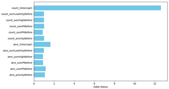 We acknowledged the observational nature of our study and discussed potential biases and limitations, such as self-selection and regression to the mean. To mitigate these, we considered alternative approaches and statistical adjustments, emphasizing the importance of cautious interpretation and the need for future, more controlled studies to validate our findings. Figure 10 presents the exponentiated coefficients from the full-hurdle negative binomial model. Each variable is shown as a horizontal bar, with the length representing the odds ratio.