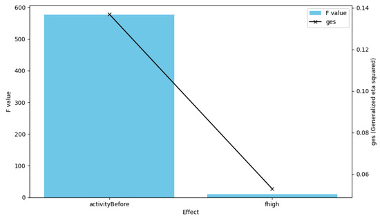 Figure 12 shows the test results of the ANCOVA, with a bar plot for the F values and a line plot for the generalized eta-squared (ges) values. The F value for `activityBefore’ is significantly higher than that for ’fhigh’, as indicated by the large blue bar, and both effects are statistically significant (p < 0.05). The ges values, which measure effect size, are shown on a second y-axis, with red markers and a line connecting them, indicating the proportion of variance accounted for by each effect.
