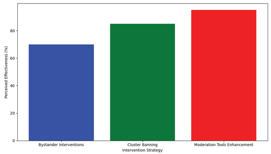 The role of moderators, as discussed in [63] emerges as a critical factor in managing online communities and safeguarding against the proliferation of harmful content. The development and implementation of advanced tools for moderation, coupled with user-driven reporting mechanisms, represent promising avenues for enhancing online safety and user experience. These discussions are visualized in Figure 14, which, while a placeholder due to specific data constraints, aims to encapsulate the comparative effectiveness of various intervention strategies across different studies. Figure 14 conceptualizes the perceived effectiveness of various intervention strategies against online harassment. It encapsulates a comparative analysis of intervention strategies, such as bystander interventions, cluster banning, and enhancements to moderation tools, suggesting promising avenues for combating online harassment and fostering safer digital environments. Both Figure 13 and Figure 14 complement the “Results and Discussion” section by providing a visual summary of this study’s key findings and the effectiveness of the proposed interventions, reinforcing the importance of strategic approaches to mitigate the adverse effects of personal attacks on social media platforms.