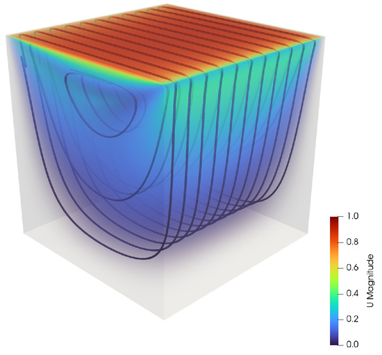- Ghia, U.; Ghia, K.N.; Shin, C.T. High-Re solutions for incompressible flow using the Navier–Stokes equations and a multigrid method. J. Comput. Phys. 1982, 48, 387–411. [Google Scholar] [CrossRef]