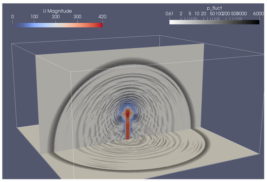 A high-speed injection of a warm gas (330 K) into a static atmosphere with a slightly lower temperature (300 K) is considered (see Figure 2). For simplicity, the jet fluid enters the atmospheric box through a square inlet (0.0635 m) resolved with a homogeneous structured mesh (no grid stretching). Given the low gas viscosity (1.8 × 10−5 Pa s) and high velocity (364 m/s) of the injected fluid, the jet flow is unsteady and compressible, characterized by high Mach number (>1 locally) and Reynolds number. Non-linear instabilities in the jet shear layer (like Kelvin–Helmholtz), vortexes, pressure waves and a turbulent buoyant plume typically develop with these conditions. In the simulations, the jet fluid, as it enters the atmospheric box, forms a vortex and pushes the static air outwards producing an intense pressure wave followed by smaller transients that propagate radially (see Figure 2). More information can be found in Brogi et al. [13].