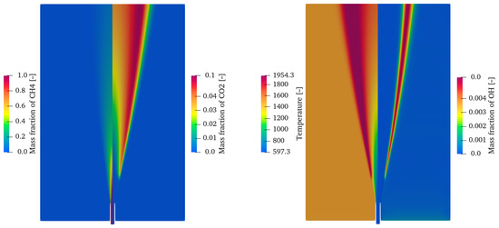 Simulation results of the DLR-JHC burner showing mass fractions of CH4, CO2, OH and temperature in K.